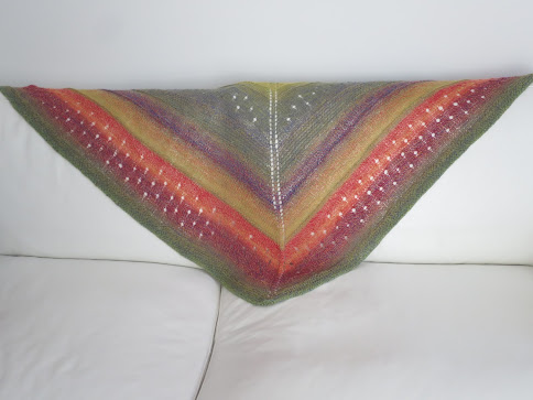 Ennen koronaa aloitettu kolmiohuivi valmistui vihdoin. Pitkä sivu 2m, lyhyet 1,6m. paino 155 g. Langan vyöte näköjään kadonnut, mutta Ogelin Lankamaailmasta aikoinaan ostettu. Malli on ihan mielikuvituksen tuotetta, väliin sileää, väliin ainaoikein kerroksia ja välillä vähän reikiä. Loppupäättely tuli kun en enää jaksanut väkertää isoa teelmää neuletapaamisissa. Menee lahjaksi tai jää itselle odottamaan sopivaa käyttöä.